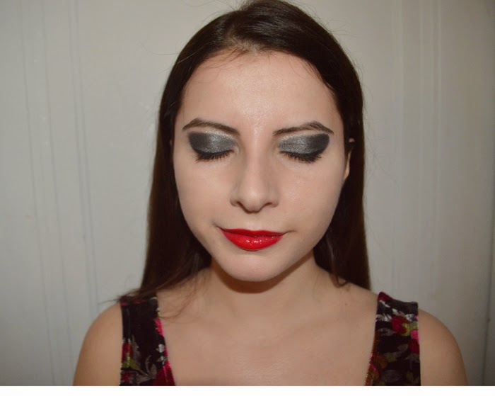 Step 3: I used an angled eye shadow brush and applied the dark shadow right in the upper corner of my eyes. Make sure this part comes across evenly. If you make a mistake I recommend taking a q-tip with lotion and tweaking any side that’s too big. To complete the shadow look I used my blending brush to slightly blend in the part where the dark grey meets the black.
